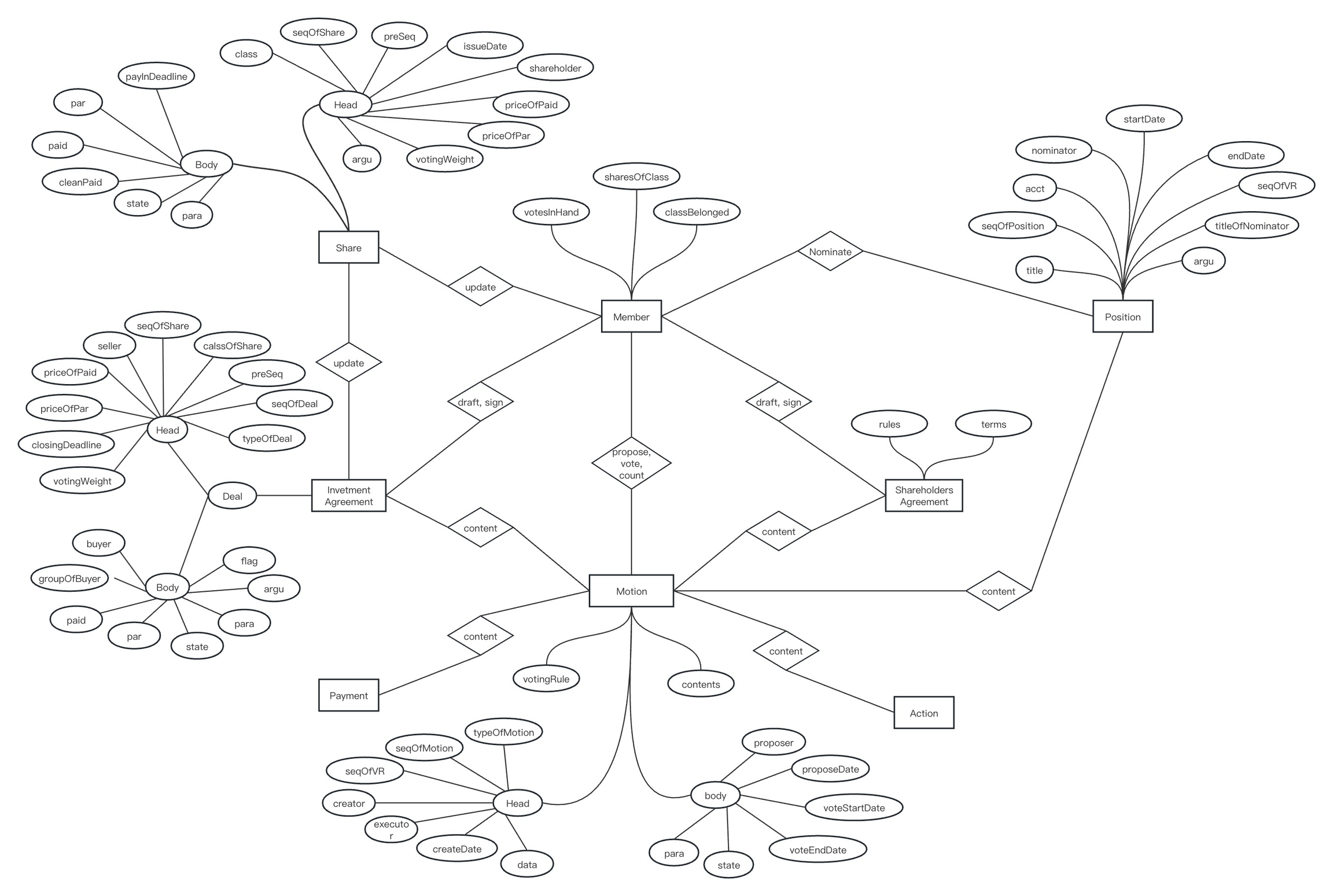 During the operation of the company, all corporate governance behaviors shall take the share registration as basis to verify the identity of shareholders and calculate the voting weights. Whether it is reviewing of share transactions, nomination and executives election, representing the company to sign the smart contracts, pay for tokens and other property, the general governance behaviors of the company is actually reflected in the motion creation, proposal and voting process, and all of these behaviors shall take articles of association, shareholders agreements and other constitutional documents as basis, in order to determine the specific procedures and conditions to be met. In the system, the shareholders' agreement is a smart contract that summarizes all the processes, rules and conditions that need to be followed in corporate governance. Of course, its own changes, as an important corporate governance behavior, should also be regulated and adjusted by its own rules.