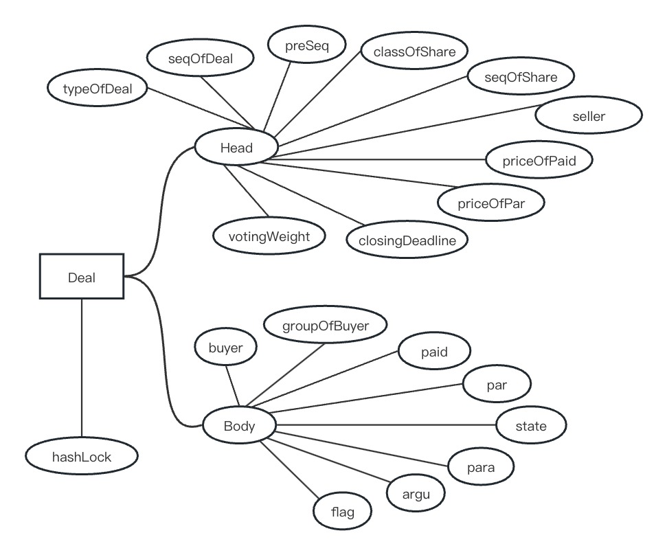 The deal object defines all the input parameters required to change the share bookkeeping, as well as a hash time lock in 32byte, using for by both parties when trade off-chain or pay equity consideration across the chain.