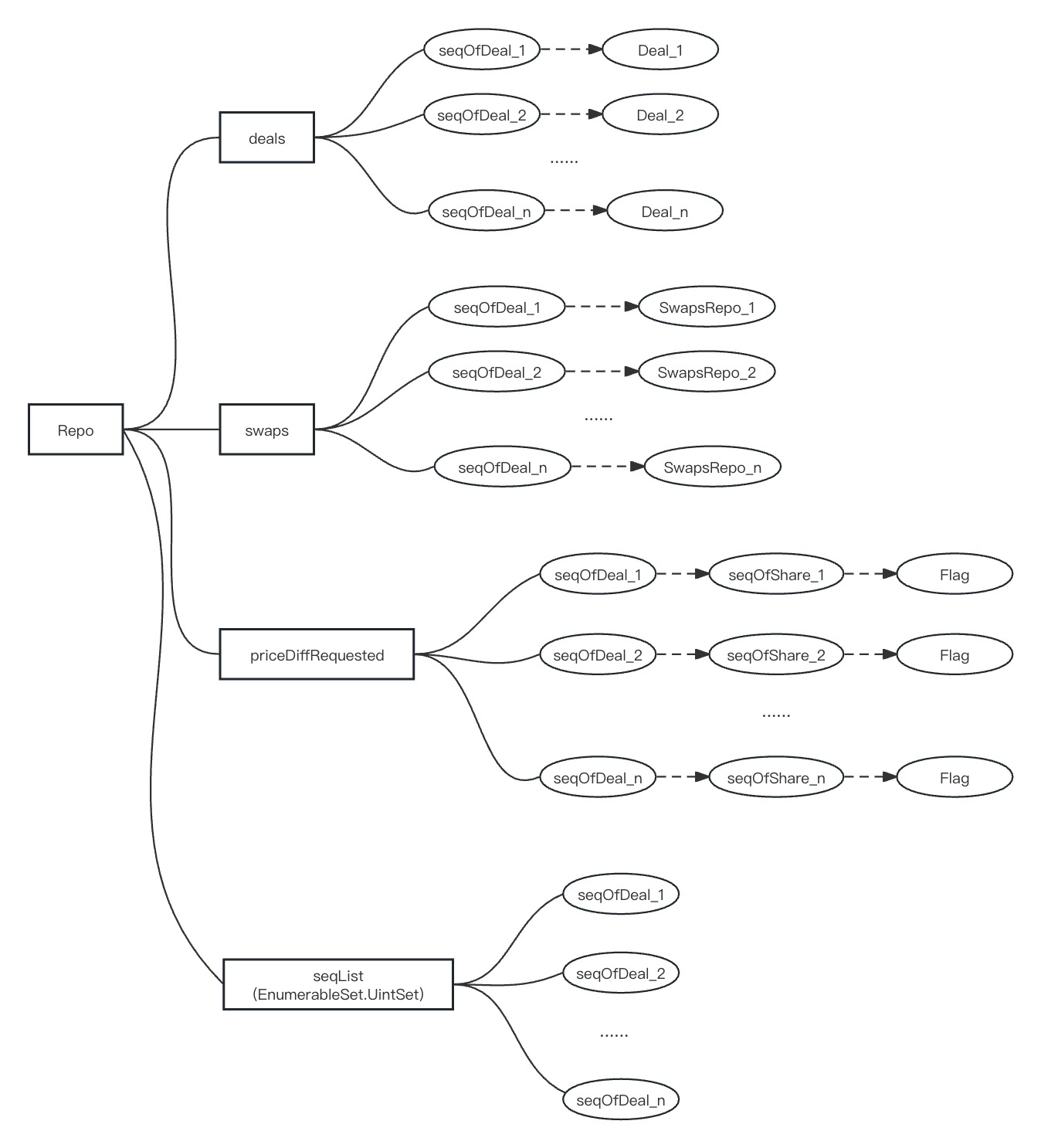 The members of the Deals Repo include the transaction mapping with the transaction number as the search key and the deal object as the search value, as well as the swap object and swap mapping designed for the realization of options.